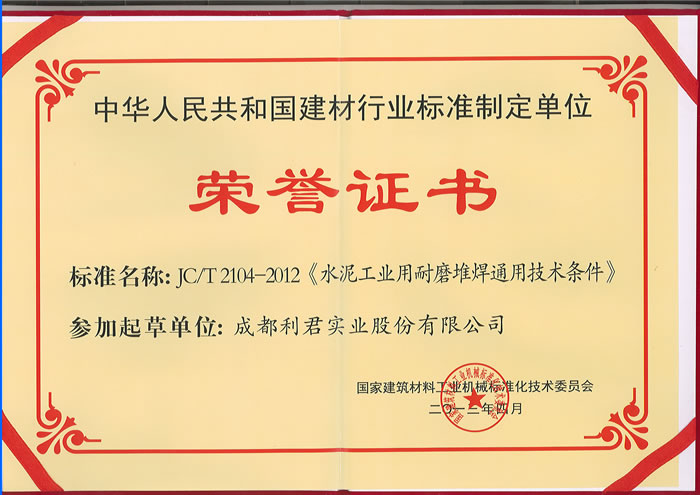 我公司荣获“中华人民共和国建材行业标准制定单位荣誉证书”、常务副总经理徐智平先生获得“JCT2104-2012《水泥工业用耐磨堆焊通用技术条件》行业标准起草人荣誉证书”、项目经理邓四文先生被评为2012年度建材机械行业标准化先进工作者。