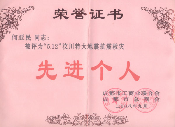 董事长何亚民被评为“5.12”汶川特大地震抗震救灾先进个人