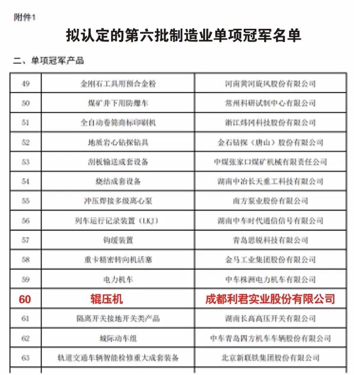近日,工业和信息化部发布了《关于制造业单项冠军第六批遴选和第三批通过复核企业名单的公示》,四川省5家企业上榜第六批制造业单项冠军企业公示名单,成都HJC黄金城实业股份有限公司辊压机入选制造业单项冠军产品名单。